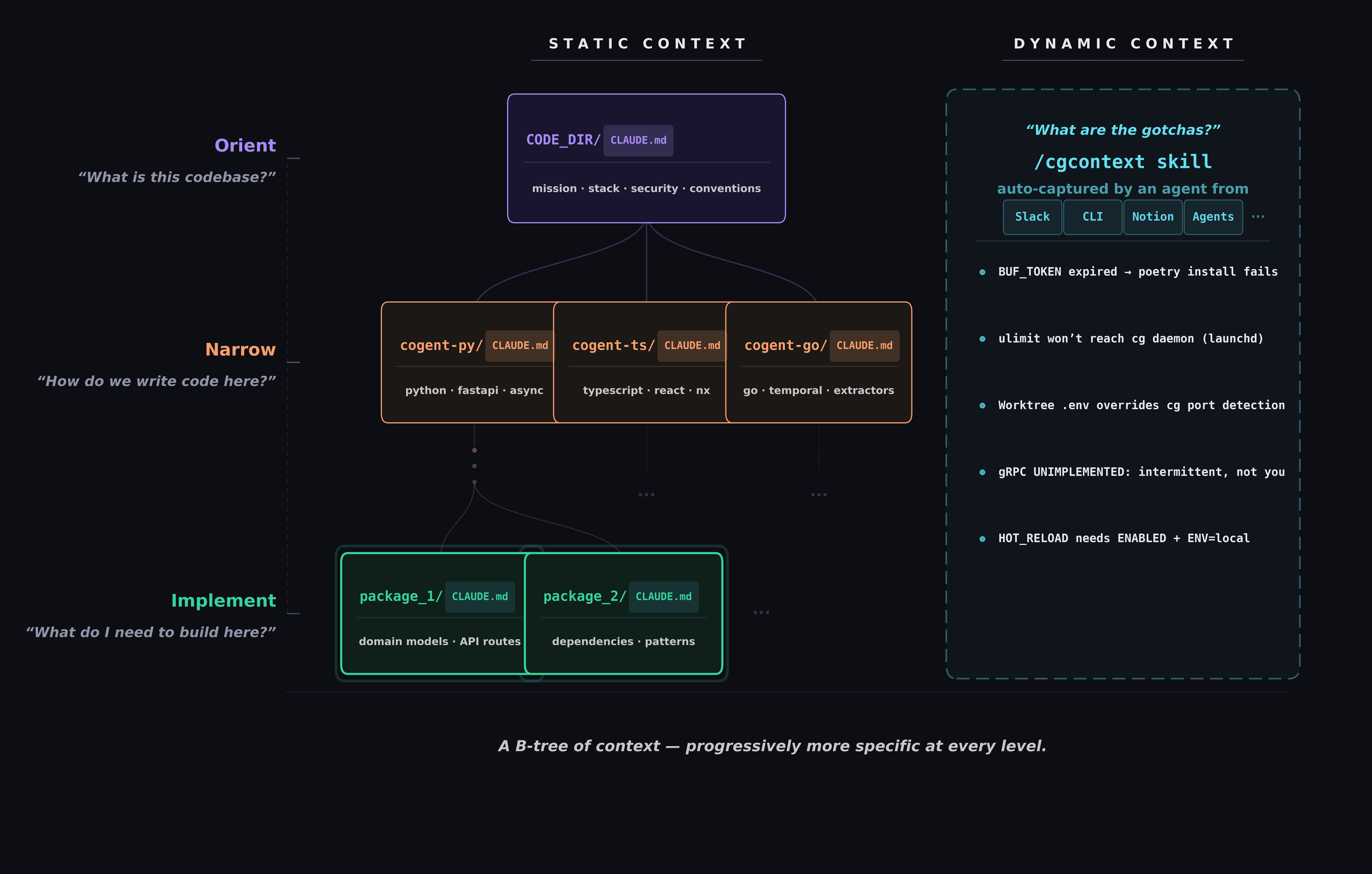 CLAUDE.md files organize as a B-tree. The root level covers product mission, tech stack, security rules — context that applies everywhere. Repo-level files add service conventions, build patterns, API styles. Package-level files narrow further to domain models and edge cases. Each layer adds specificity without duplication. An agent working on a specific package inherits everything above it. From that node, the agent searches the codebase and loads task-specific files — the hierarchy seeds context, then the agent digs into specifics.